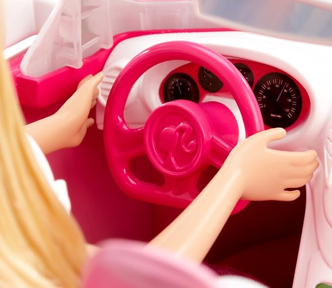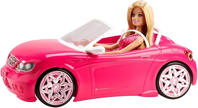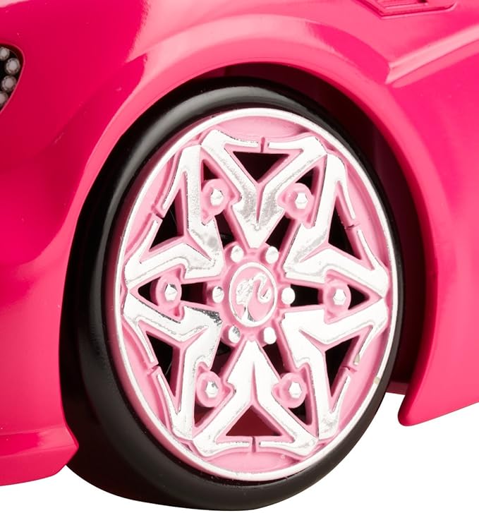 Features shiny-metallic wheels signature pink print interior, Barbie logo license plate and holofoil lights