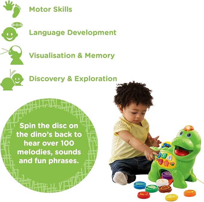 FUN MUSICAL TOY FOR BABIES: After feeding DIno, spin the disc on his back to hear over 100 melodies, sounds and fun phrases to sing-along, dance and laugh