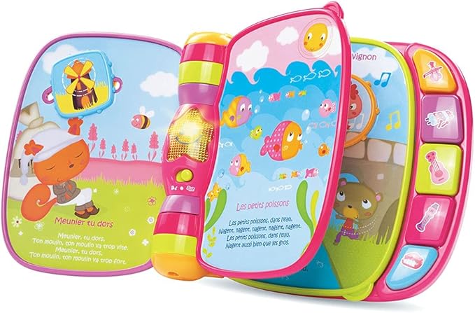 A talking and musical book with 6 traditional rhymes to listen: Sucker you sleep, Les petits fish, Turne petit min, Sur le pont d'Avignon, Le grand deer, Apple de reinette.