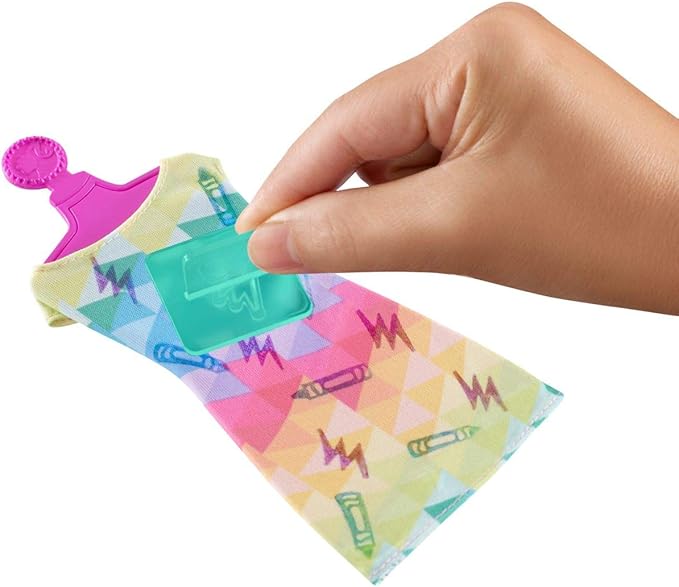 This Barbie playset includes 4 washable fashions and 10 unique stamps, like a star, teddy bear, lightning bolt, Crayola crayon and more. Select a doll fashion and place on the dress form, then choose the stamps for your design.