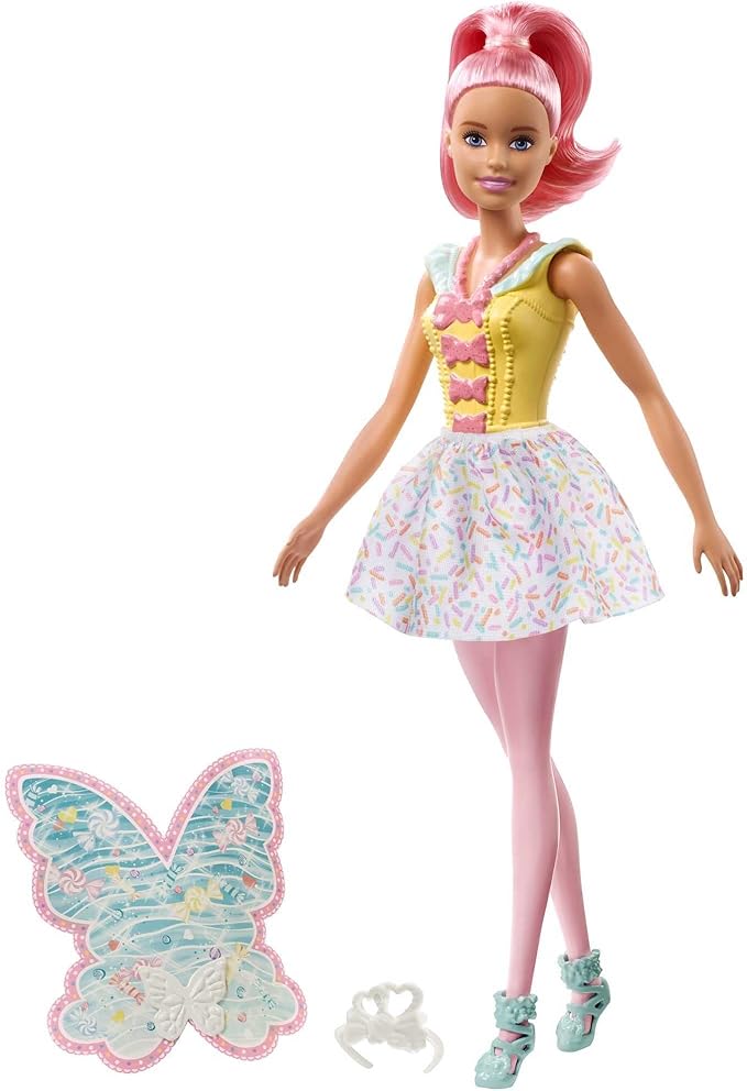 Barbie doll is ready to fly into adventure with a sweet pair of candy-decorated wings.
