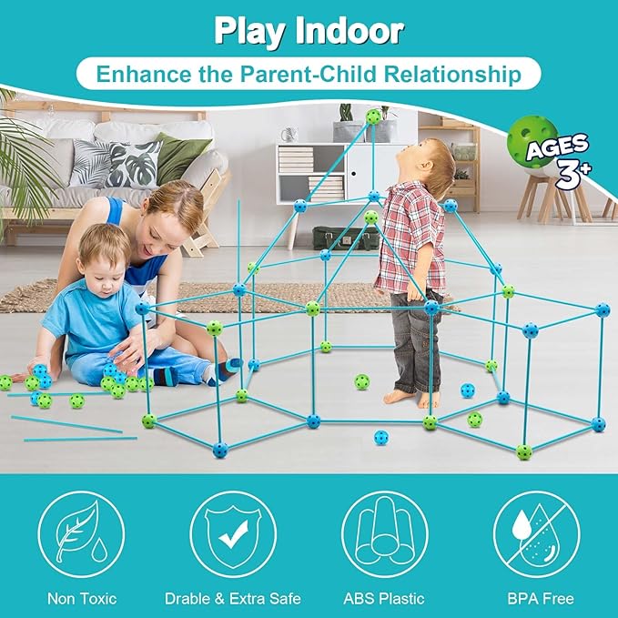 ★【Easy to Build&Durable】: Kids fort kit made with solid and premium plastic, simply insert and twist the sticks into the balls, builder connect in a few seconds and easily disassemble, no structural collapse. Come with a storage bag, protable for indoor and outdoor activities.
