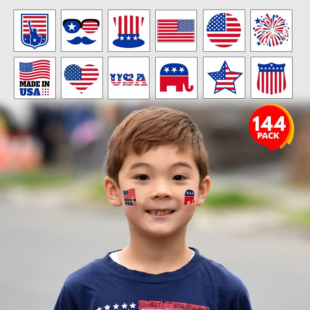 CELEBRATE THE OCCASION: Whether it’s 4th of July, Veteran’s Day, or Memorial Day, these patriotic tattoos for kids add a patriotic touch to the celebrations. Every bulk pack comes with 144 (1.5”) tattoos to give you great bang for your buck and exude American pride in super-cool style.