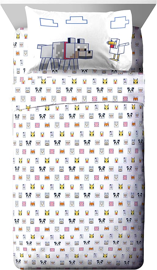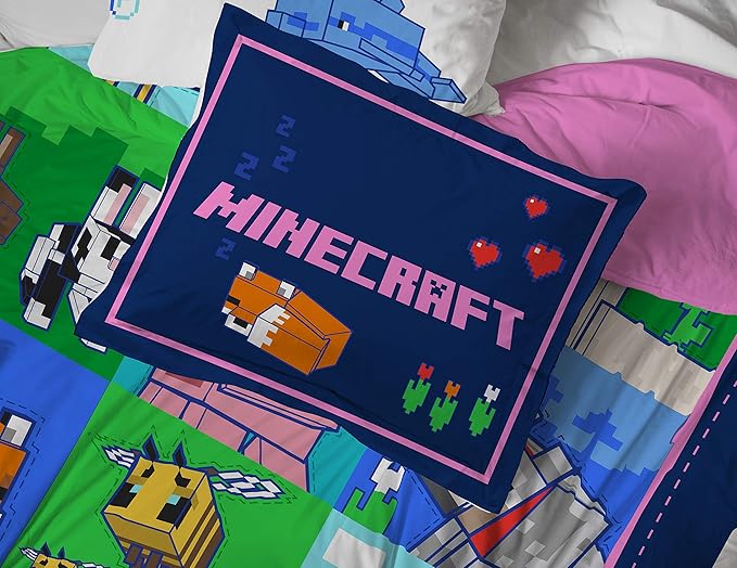 PERFECT FIT & FUN DESIGN - This Minecraft twin bed set includes (1) 64 x 86 inch twin comforter, (1) 39 x 75 inch fitted sheet, (1) 66 x 96 inch flat sheet, (1) 20 x 30 inch standard pillowcase, and (1) 20 x 26 inch sham. Add a touch of decorative enchantment to your room with our fashionable and super soft Minecraft Bed Set.
