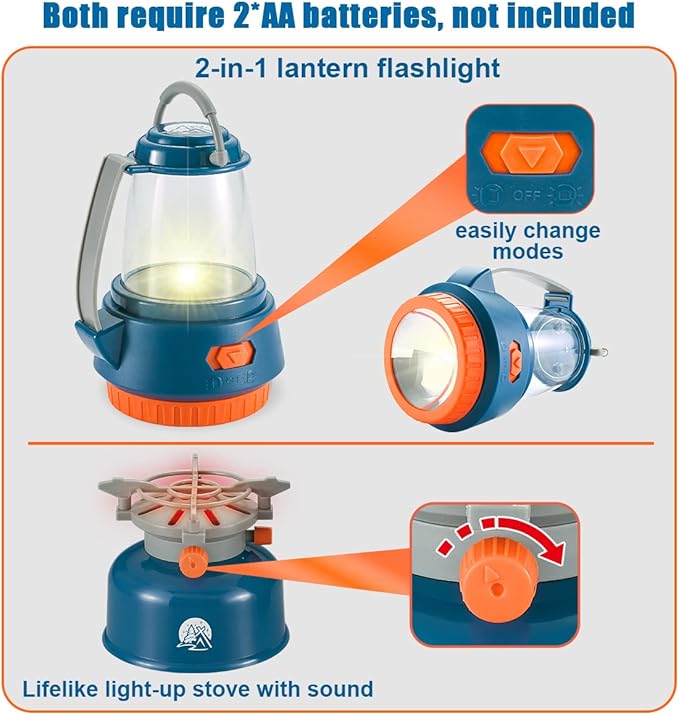 LIFELIKE 2-IN-1 FLASHLIGHT-LANTERN AND CAMPING STOVE: The flashlight could light up bright for kids camping needs or playing in the backyard, it could easily change to lantern with just a slide of the button. The little camping stove could light up with realistic sound makes pretend play games almost like real. Both require 2 AA batteries(Not included)