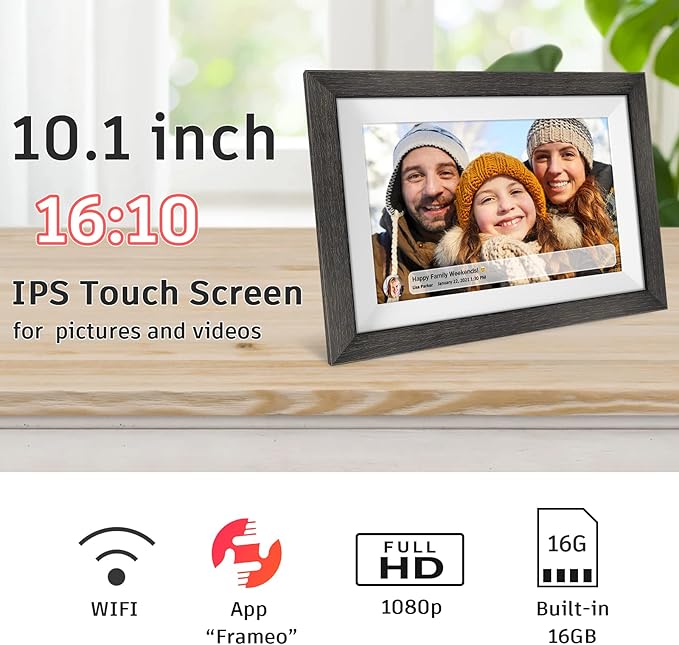 Digital picture frame HD touch screen:Wifi digital picture frame is 10.1 inch HD 800*1280 IPS full viewing angle, with touch and automatic rotation function,Support FHD 1920*1080P photos and (30FPS) short videos
