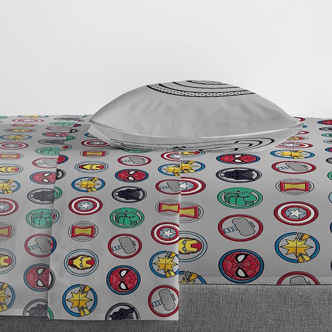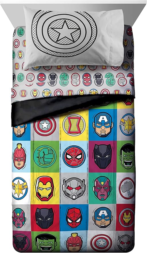 PERFECT FIT & FUN DESIGN - This twin bed set includes (1) 64 x 86 inch twin comforter, (1) 39 x 75 inch fitted sheet, (1) 66 x 96 inch flat sheet, (1) 20 x 30 inch standard pillowcase, and (1) 20 x 26 inch sham. Add a touch of decorative enchantment to your room with our fashionable and super soft Avengers bed set.