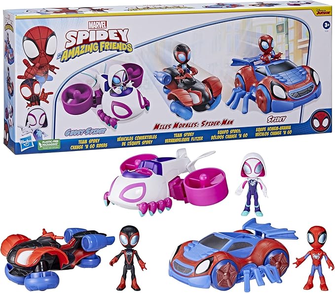 ALL 3 SPIDEY TEAM VEHICLES: Web-out with the whole Spidey Team, with this Spider-Man playset for boys and girls of 3 Spidey and His Amazing Friends Change N Go Riders . With 3 figures and 3 converting vehicles, it’s full-team fun .