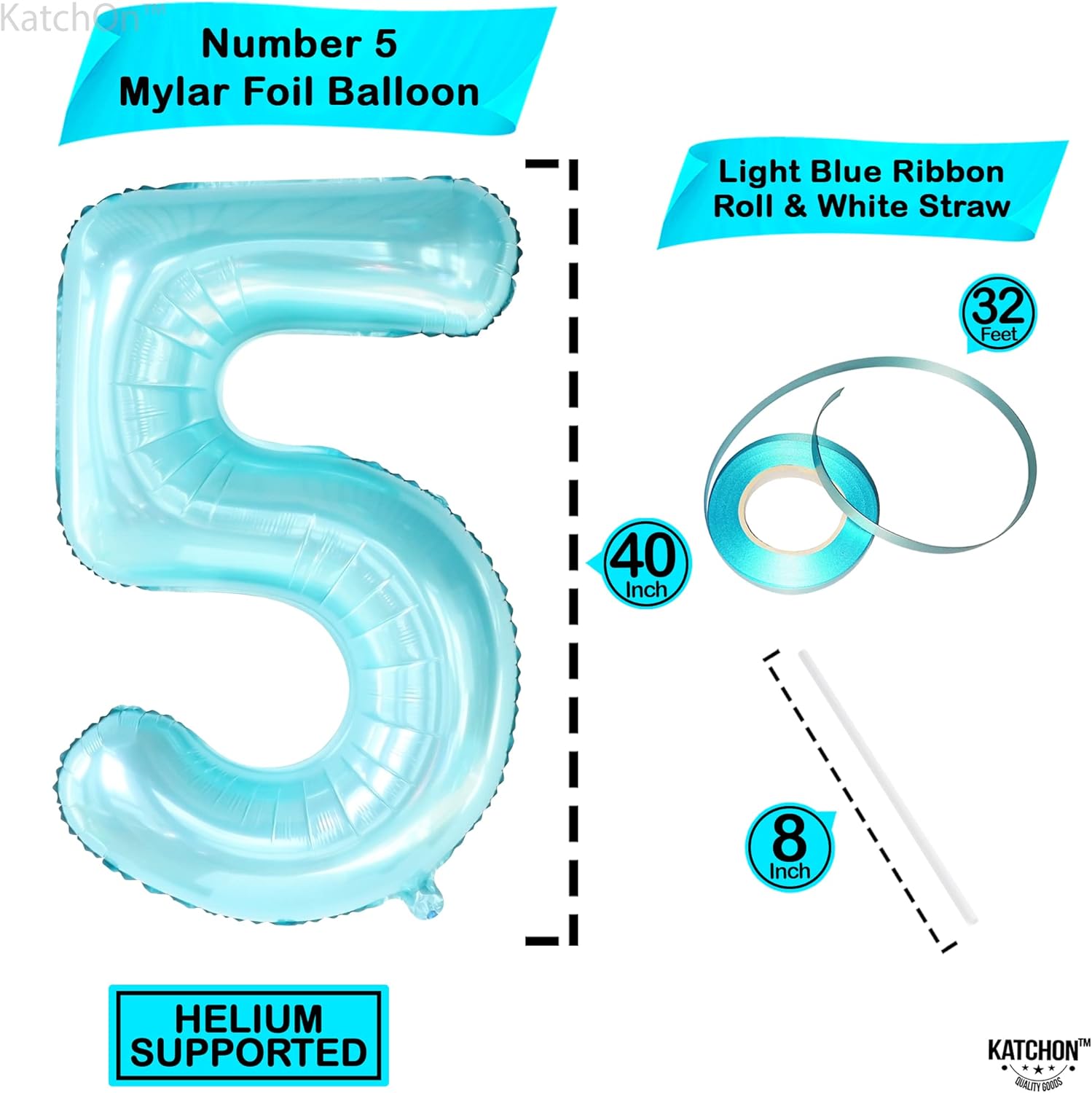 LARGE SIZE - 40 INCH | PASTEL FINISH BIRTHDAY BALLOONS : This light blue number 5 balloons for birthdays is the party complement you shouldn’t miss. Add a great impact to your decoration with this 5 balloon light blue, 40 inch, 1 blue Ribbon and 1 Straw. Pair light blue 5 year old balloon with other number balloons blue for under the sea birthday decorations, 5th birthday party decorations, anniversary. Use this light blue number five balloon for baby shark 5th birthday decorations.