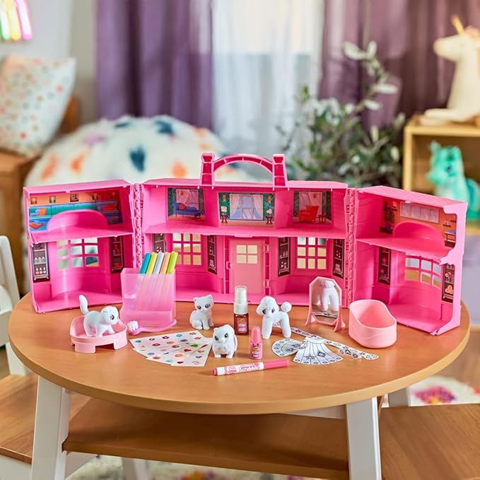 TOY FIGURES & PLAYSET: Includes 1 Large Salon that doubles as storage solution, 4 Pets, 6 Markers, 1 Scented Spray Bottle, 3 Washable Sticker Sheets, and 1 Pearlescent Paint Bottle.