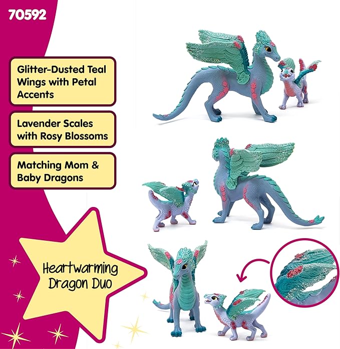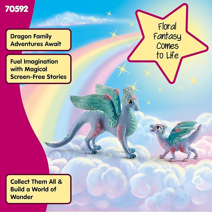 2 DRAGONS FOR DOUBLE THE MAGIC - The sparkling flower dragon and her adorable baby dragon make a perfect pair for double the adventure and fantasy play in this schleich dragon figurine playset