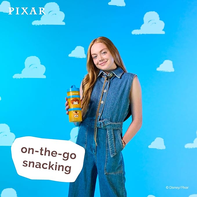 Stackable, interlocking containers for snacking on the go, featuring officially-licensed Pixar graphics