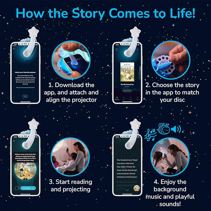 Interactive Storytelling With Projector, Music, and Sparkling Sounds: Get little ones engaged with 4 fun Classic Disney book projection stories and their visual pictures; Simply attach the projector to your smartphone flashlight, download the interactive app and select your story to launch an unforgettable storytelling moment with your kids