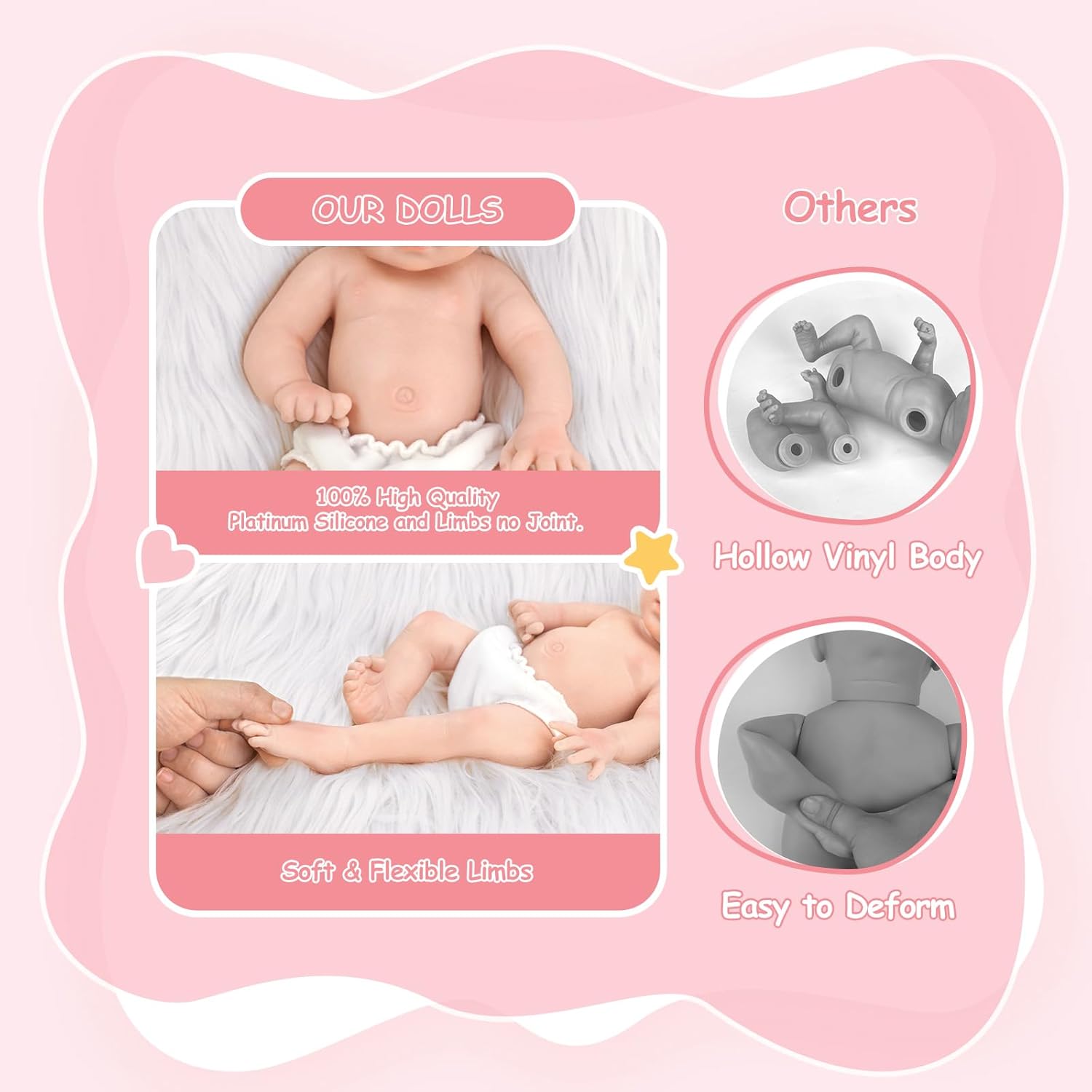 Weighted and Floppy: weighing 3.3 lbs, this platinum silicone baby doll looks and feels incredibly realistic. Perfect for holding, patting and cuddling. You'll experience the joy of cradling a newborn.