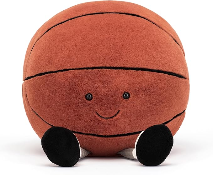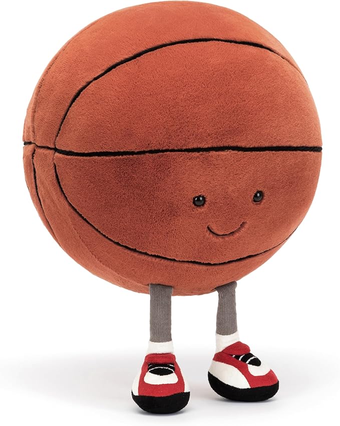 Amuseables Basketball: Score big with your favorite basketball fan! A crowd pleaser with a winning smile and rich orange fur accented by black felt lines, Amuseables Basketball is ready to hit the court. Two tiny cord legs end in a pair of eye-catching kicks in red, black, and white.