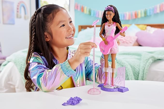 The brunette pop star doll's removable outfit features a cool dress with iridescent pattern and strappy pink heels -- perfect to role-play a performance on-stage.