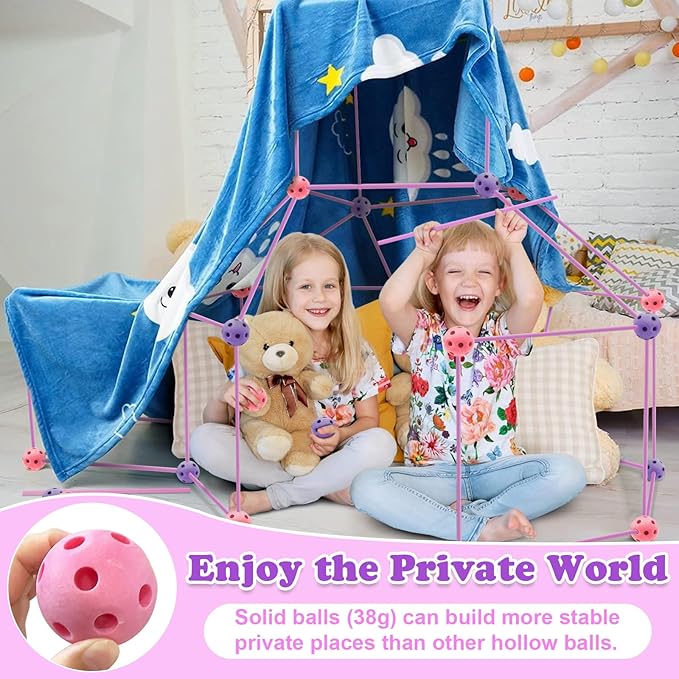 ★【Construction Fort Building Kit】:Find a creative way to encourage kids engage in the actual game? Look at the fort builder kits-Includes 75×Sticks, 23×Purple Soild Balls and 22×Pink Soild Balls. Comes with a storage bag for easy storage and carrying.120PCS magic making set allows boys and girls to build fort of various shapes and sizes! (Blanket Not Included.)
