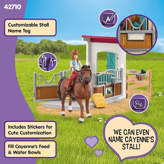 Schleich Horse Club - 25PC Hannah and Cayenne Horse Toy Stall Playset with Accessories - Customizable Stable Name Tag - Realistic, Posable Rider and Pony Toys for Girls and Boys - Kids Ages 5+ - 42710