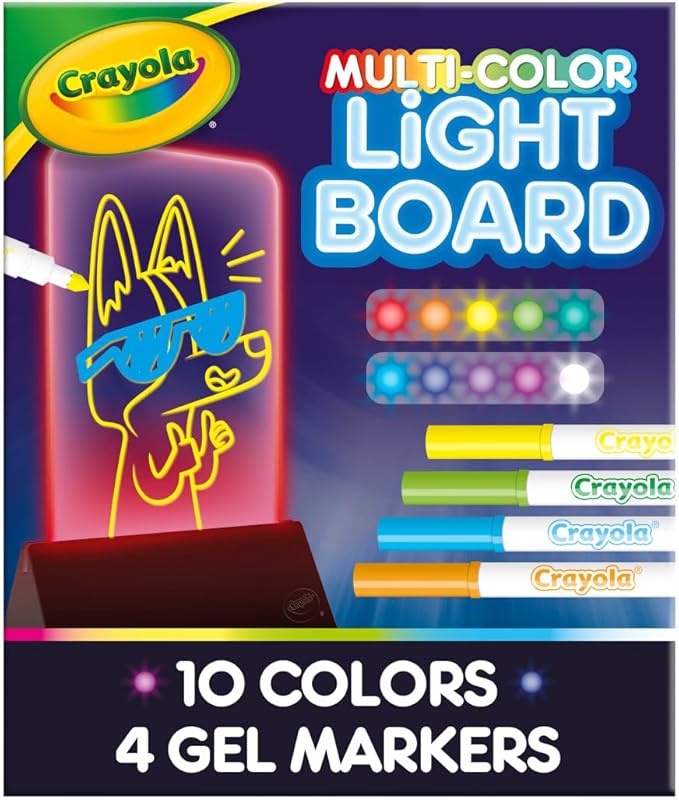 CRAYOLA PORTABLE LIGHT BOARD: Features Crayola Light Up Drawing Tablet that glows in 10 different colors, and includes 1 Base, 4 Gel FX Markers, and 1 Instruction Sheet. (Requires 3AAA batteries - not included).