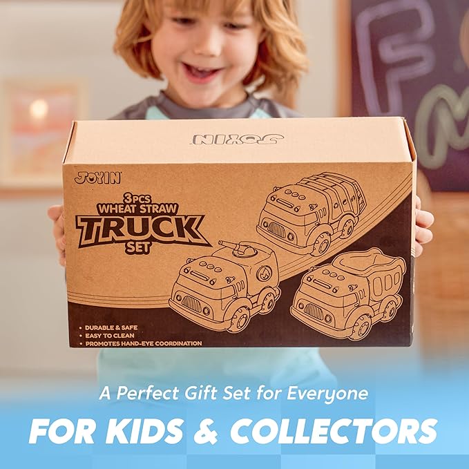 EXCITING TRIO OF TOY TRUCKS- Unbox a world of adventure with our 3-piece Wheat Straw toy truck set! This dynamic ensemble includes a Garbage Truck, Fire Truck, and Construction Truck (), creating the ultimate playground for imaginative play.