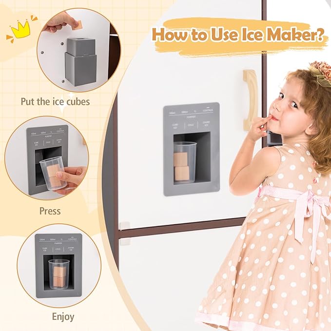 Multifunctional Play Kitchen: This versatile corner kitchen playset comes fully equipped with essential kitchen appliances to mimic a real-life cooking space.The ultimate kitchen playset includes range hood, stovetops, oven, microwave oven, sink & facet, washing machine, refrigerator and a funny ice maker. Plus, abundant accessories are provided to add much role-play fun.