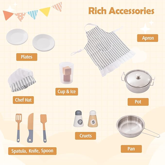 Stable Corner Play Kitchen: This toddler kitchen playset is made of wooden material, ensuring high stability and durability. Plus, it is certificated by ASTM and CPSIA for reliable use. And edges and corners of this toy kitchen are smoothly rounded to prevent children from bumping into them while running or playing.