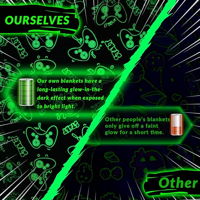 GLOW IN THE DARK BLANKET - Video game blanket is mysterious and interesting. It can shine in the dark. Just expose it to a bright light source or sunlight for about 15 to 20 minutes. The brighter the light, the stronger the blanket will be in the dark. Creating a beautiful atmosphere for your bedroom. Whether your kids loves the idea of a night time adventure or you just want to add a special touch to their bed, these glow in the dark gaming blanket are a good way to upgrade comfort and style.