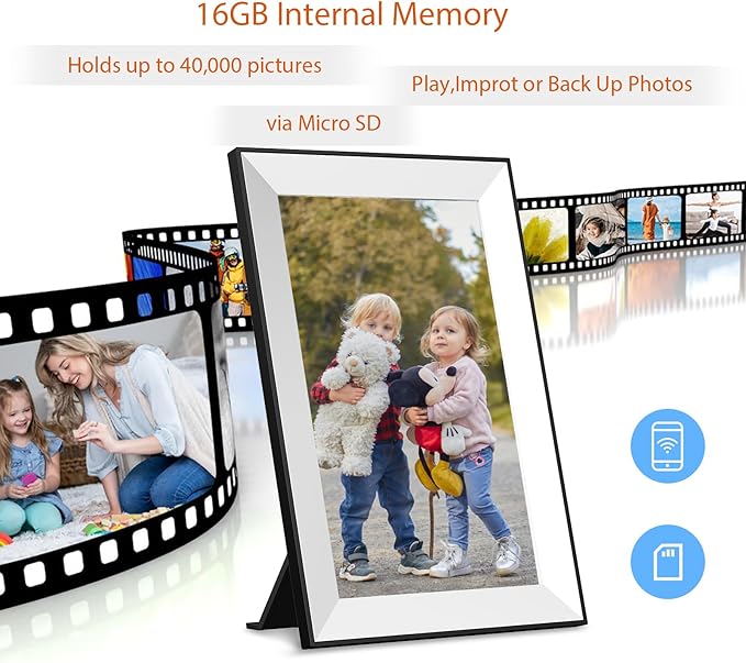 Digital photo frame is a high-definition display screen:Digital photo frame is 10.1 inch WiFi electronic photo frame is perfect for placing on a desktop. It has an automatic rotation function and is equipped with a high-definition display screen with a resolution of 1280*800, using IPS full-angle technology, so you can get excellent visual effects no matter which angle you view it from. This digital photo frame has built-in 16GB storage space, which can store more than 40,000 photos and allows you to display any photo anywhere