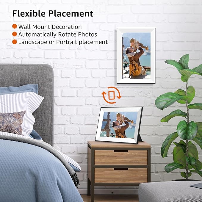 Auto-Rotate and Slideshow:Digital picture frame comes with an auto-rotate photo feature that can adjust the frame orientation based on the slideshow size, whether it's in portrait or landscape mode. The frame can also be mounted on the wall, with two wall-mounting holes on the back cover. It's also perfect for displaying on a tabletop