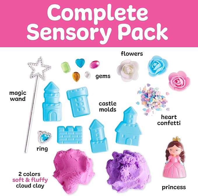 PRINCESS GIFTS FOR GIRLS: Give the gift of creative play to preschoolers who love to work with their hands! This low-mess sensory kit is filled with princess toys, stretchy cloud clay, tools, and a variety of fun items to touch and explore! Squish, create, and enjoy a whimsical sensory experience, ideal for sensory toys for toddlers 3-4 and charming princess gifts for girls