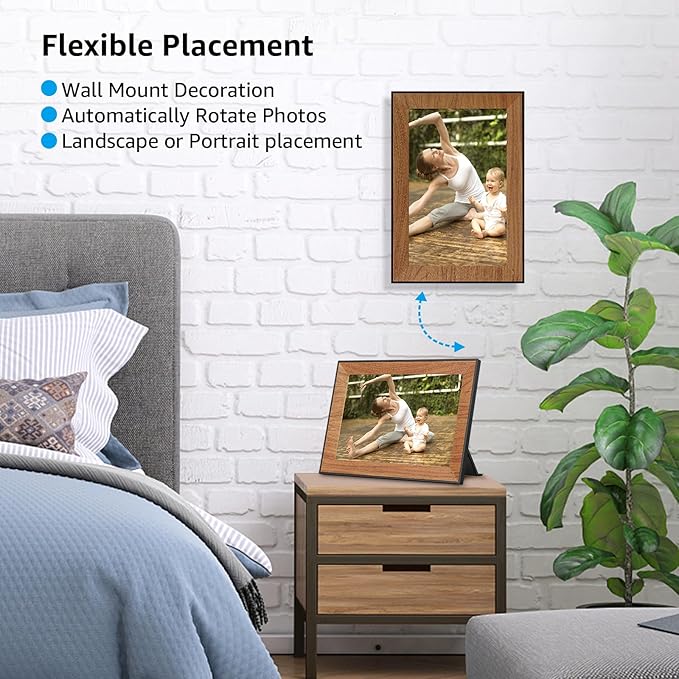【AUTO ROTATION & STYLISH DESIGN】Our digital photo album features a sleek wooden frame design that complements your existing picture frames. It can be placed in portrait or landscape mode, and automatically rotates photos to ensure a perfect fit. Whether for your living room, bedroom, or office, this versatile frame is an ideal choice for enhancing your décor
