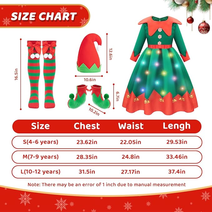 Light Up Christmas Elf Dress Full of Charm and Fantasy Makes Little Girls Special. Besides the unique light up elf costume for girls, there are head to toe Christmas dress up accessories - including an adorable elf hat, long Christmas socks and classic elf shoe covers. Just transforming into Santa helper with Meland complete Christmas costume for kids.