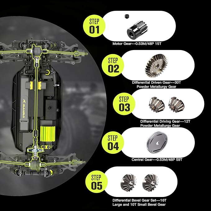 The steering CVD of our car uses 1144 carbon steel HRC42-48, the rear dog bone, steering tie rod, differential cup, active gear cup, active gear flat cup, longitudinal drive shaft and upper tie rod all use 1144 carbon steel HRC36-42, and the rear wheel axle uses 1144 carbon steel HRC42-46. The materials are all strengthened, stronger, wear-resistant, and not easy to break, so that players can play more worry-free and have more fun