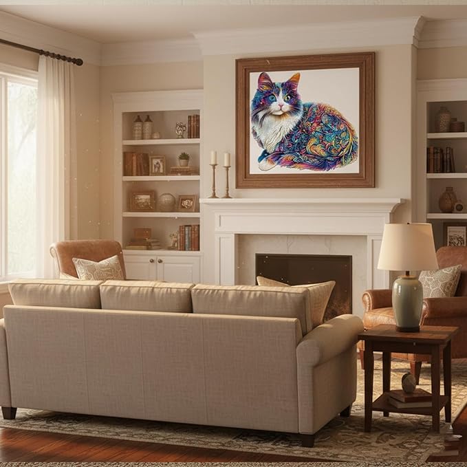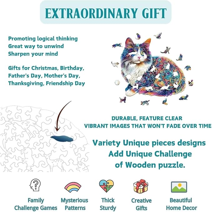 【UNIQUE CAT PUZZLE DESIGN】Escape into the world of felines with this exquisite cat puzzle. Every piece of this cat shaped wooden puzzle celebrates the feline form, setting it apart from ordinary cat puzzles. Assemble a beautiful work of art—the perfect, relaxing gift for any cat lover or a tranquil treat for yourself.