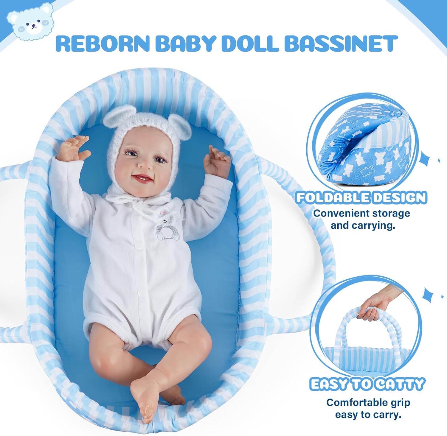 BABESIDE Reborn Baby Doll Bassinet for 17-22 Inch Dolls, Cute Bear Patterns Baby Doll Accessories Soft Foldable Babydoll Crib Bed with Handle for Newborn Dolls Boys, Blue