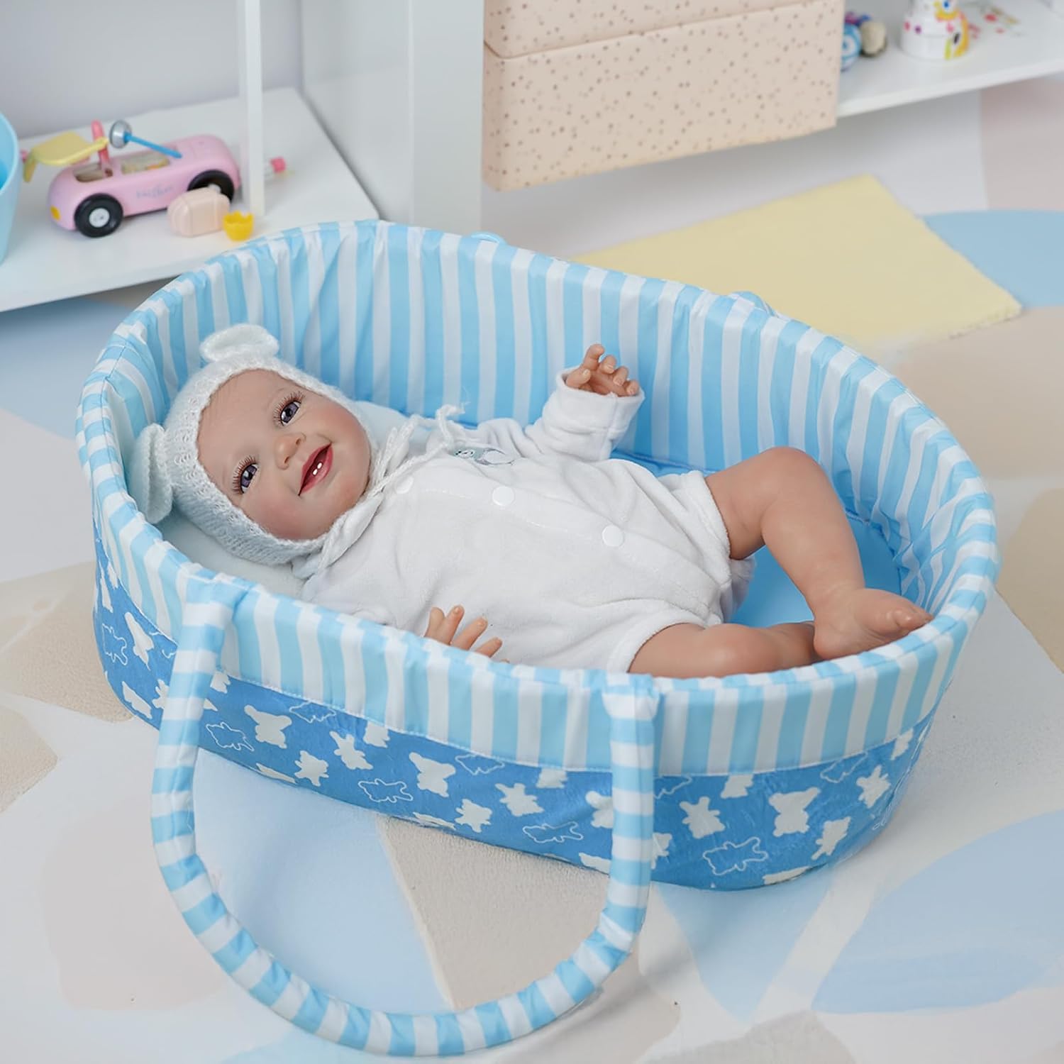 Baby Doll Accessories Size: This reborn baby doll bassinet with handle is perfect suitable for 17-18-19-20-21-22 inch realistic baby dolls, and the reborn doll accessories can be hand washed or machine washed and reused