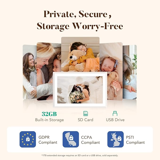 Storage Worry-Free: With the built-in 32GB storage, it becomes possible for you to stock upwards of 40,000 photos, each measuring around 600KB. Moreover, you can enjoy the convenience of directly playing photos from external storage media like an SD card or a USB-A flash drive