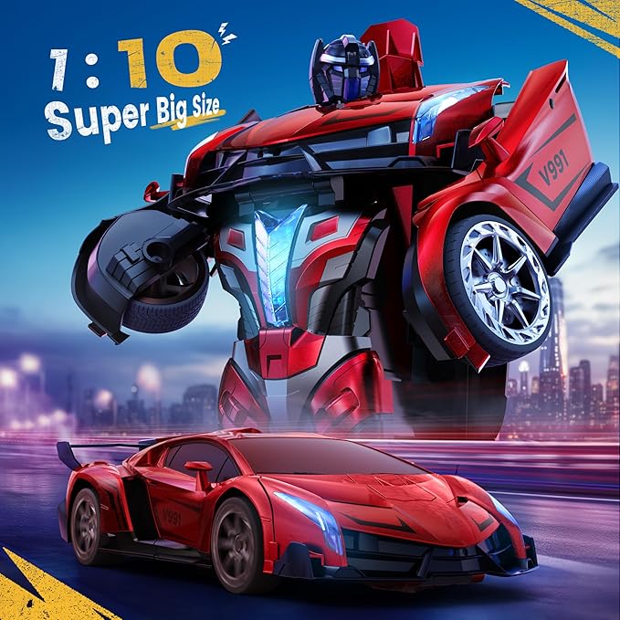【Big Size and Impressive Design】With a 1:10 scale (size when transformed into robot form: 11.8 X 13.8 X 15.2 inches), the V991 Transform RC car boasts a more spacious body and an even more stunning transformation effect compared to common RC cars. This RC car offers an ideal option for players seeking realism and immersive experiences, elevating the fun of transforming toys to a new level.