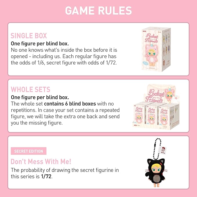 POP MART Baby Molly Pocket Friends Series-Vinyl Plush Pendant Blind Box: The blind box contains a random figure from a specific series. Each blind box only contains one figure. No one, including us, knows what's inside. This collection contains 6 blind box figures, one of them might be the secret edition.
