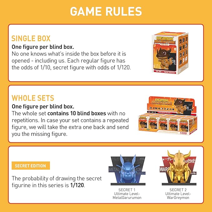 POP MART Digimon Adventure Fridge Magnet Series Figures: The blind box contains a random figure from a specific series. Each blind box only contains one figure. No one, including us, knows what's inside. This collection contains 10 blind box figures, one of them might be the secret edition.