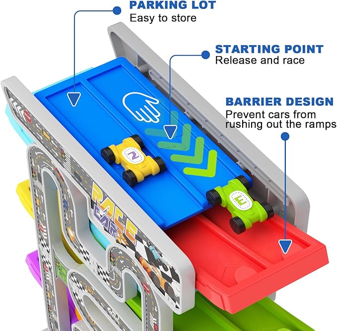 2-PLAYER RACING GAME: Our Montessori toys for 1 2 3 year olds are perfect for two children to play together. Simply release the cars at the starting point and begin the race! The pull-out storage base lets the cars slide down and stop, making storage easy and preventing them from getting lost. Great games for 2 3 year olds kids.