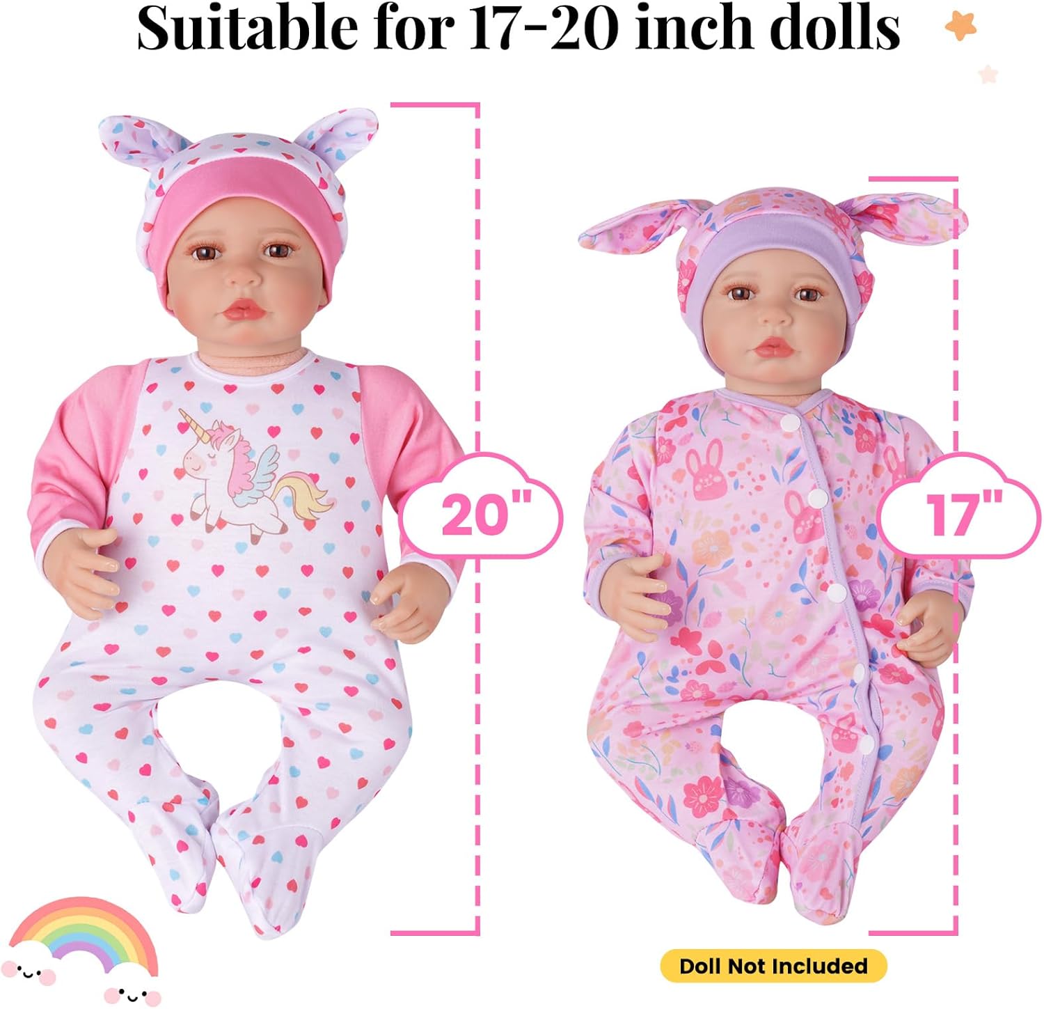 BABY DOLL CLOTHES SIZE - Unicorn, bear and bunny pattern design reborn baby doll clothes are available for reborn baby dolls and realistic baby dolls ranging from 17-20 inch.