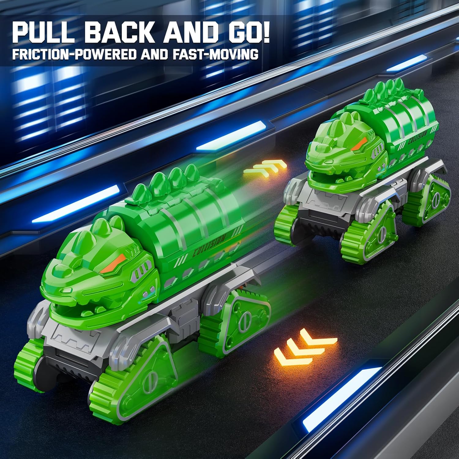 Two Forms Robots Easy To Assemble- Each dinosaur toy car has parts that can be moved, transform the tracked vehicle into a body part and connect it with four other toy vehicles to form a large robot. Has two merged forms - Robot and Dinosaur Warrior, super cool look with vibrant color car set encouraging imagination and creative thinking, make these the perfect dinosaur toys for boys girls 3 years old above.
