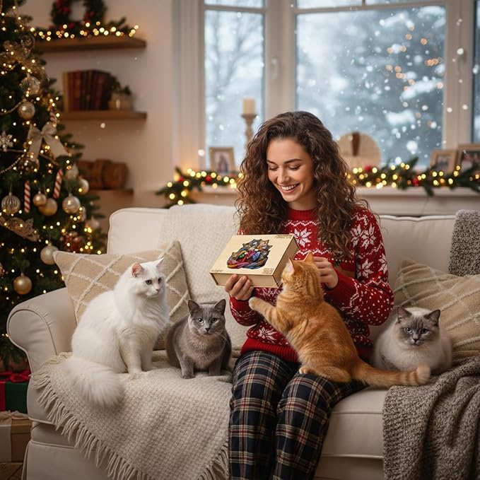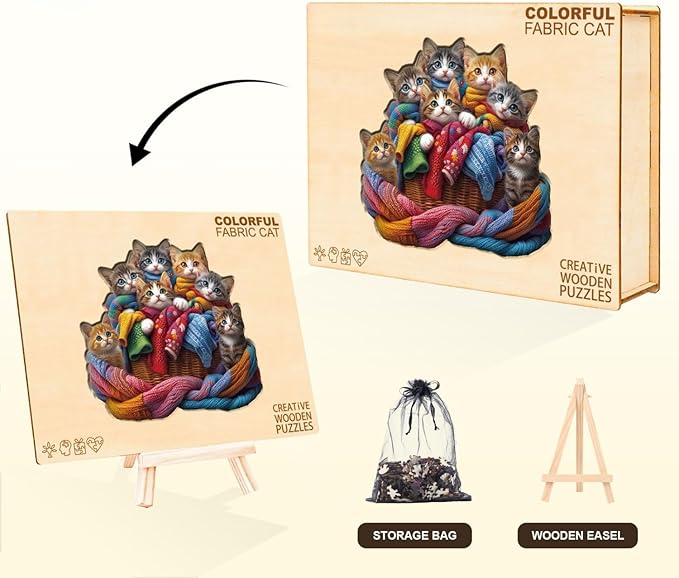 【UNIQUE CAT PUZZLE DESIGN】Escape into a heartwarming scene with this exquisite wooden jigsaw puzzle featuring 7 fluffy kittens nestled in a wicker basket. Wrapped in vibrant colorful knitted scarves, these adorable tabby, ginger, and calico cats come to life with high-definition artistry. Unlike ordinary puzzles, our unique animal shaped pieces celebrate the feline form. A perfect, relaxing gift for cat lovers to enjoy the warmth of this cute kittens-themed artwork.