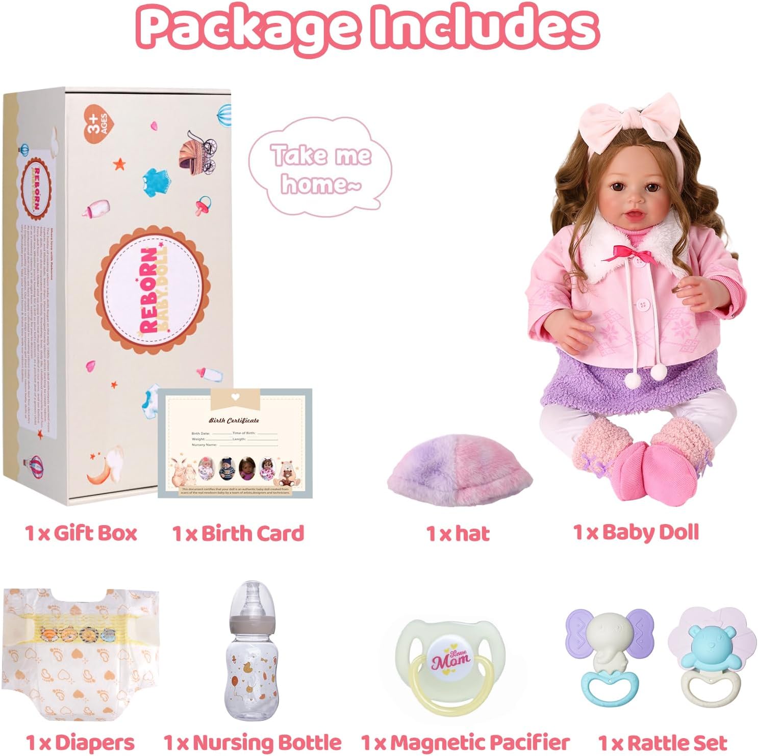 Take Her Home Now: Our baby doll comes in a lovely gift box and includes a full set of accessories for taking care of a newborn. This lifelike newborn doll is not only a thoughtful present for your child, but also a practical one that encourages nurturing and imaginative play.