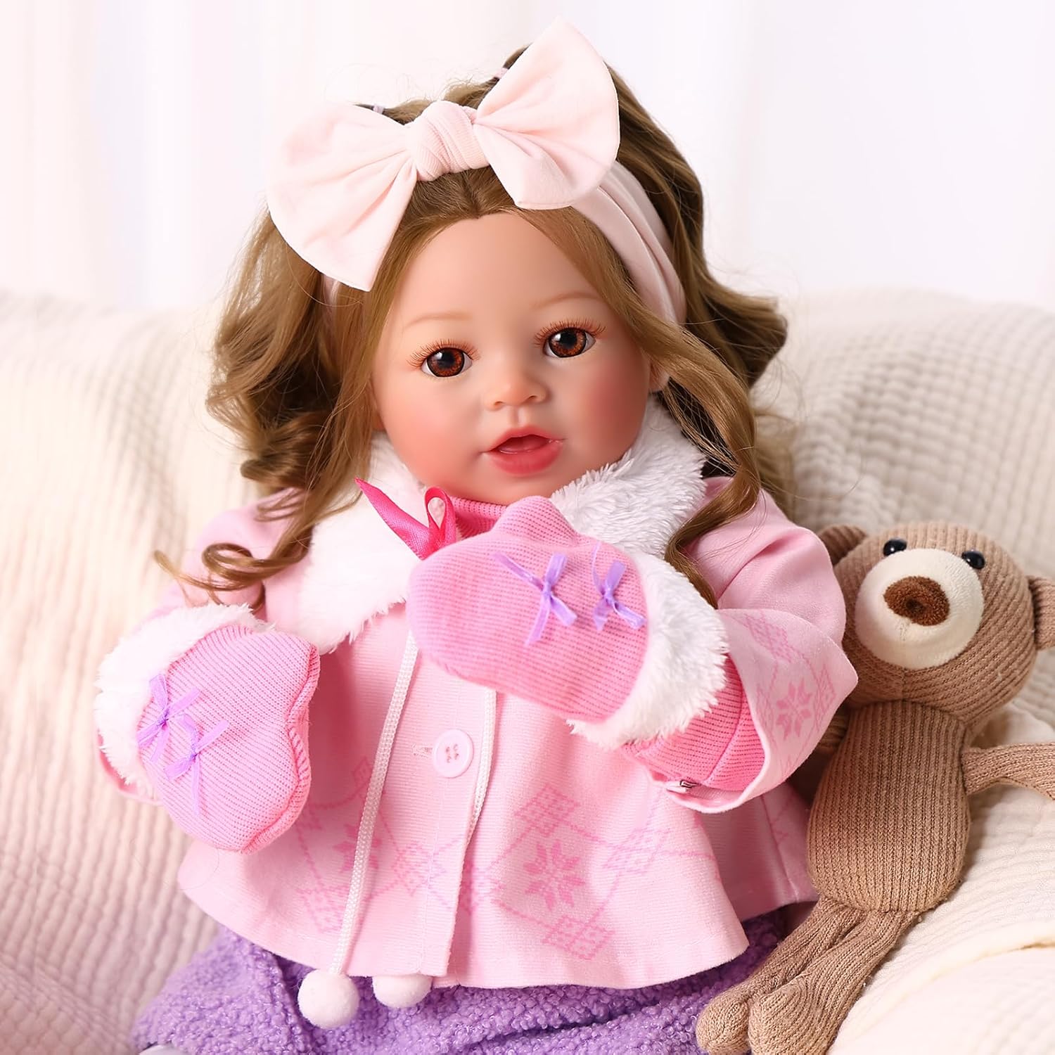 Sweet & Realistic Newborn: This beautifully crafted reborn doll features soft, styleable brown hair and striking eyes with delicate hand-rooted eyelashes for an ultra-lifelike appearance. Her poseable limbs allow natural sitting or lying positions, while subtle blush on her cheeks brings her lovingly to life.