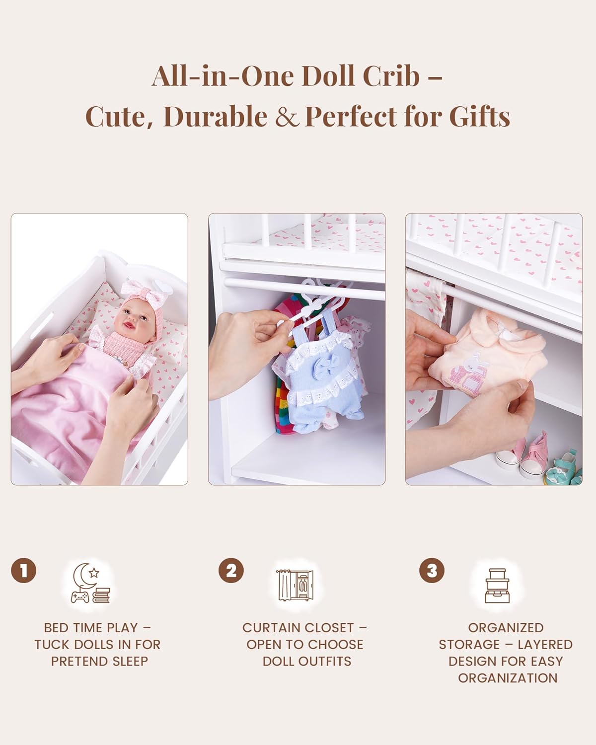 BABESIDE Baby Doll Crib & Bed with Storage, Bedding, and Accessories – Realistic Wooden Doll Bed for 12-16 Inch Baby Dolls, Perfect Baby Doll Accessories Gift for Kids Age 3+