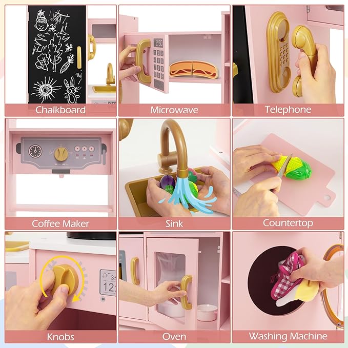 Various Play Areas: The pretend kitchen playset is designed with a microwave, telephone, coffee maker, countertop, sink, oven and washing machine as more play options. The chalkboard invites kids to jot down the daily menu, encouraging their literacy and planning skills.