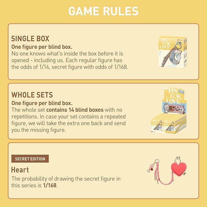 Random Design: Blind boxes are fully random and we cannot accept requests for specific items. There chances of getting the secret edition are usually 1/168. When purchasing the whole set, there will be no duplicates figures. However, if you order multiple single boxes, there is possibility to get duplicates.
