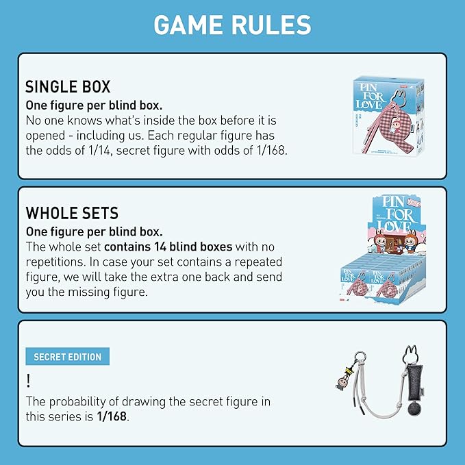 • Random Design: Blind boxes are fully random and we cannot accept requests for specific items. There chances of getting the secret edition are usually 1/168. When purchasing the whole set, there will be no duplicates figures. However, if you order multiple single boxes, there is possibility to get duplicates.